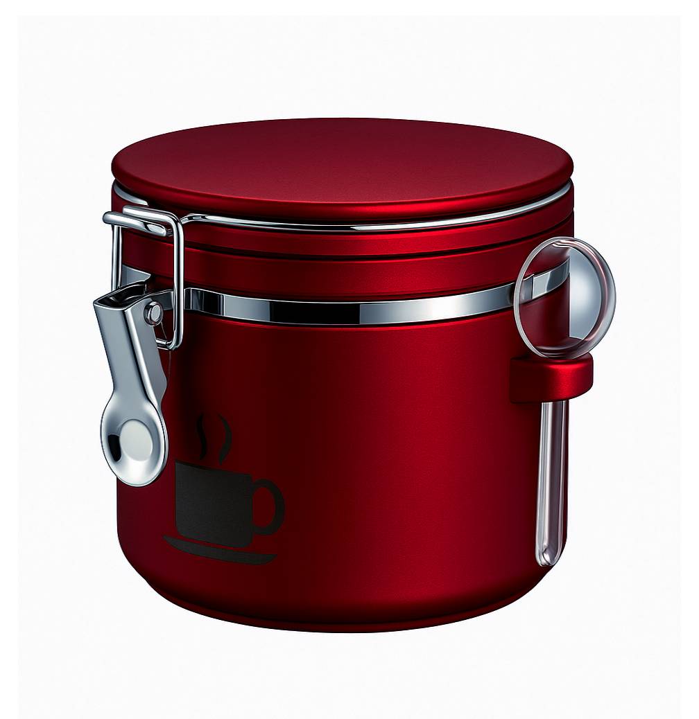 Snygg, stilren kaffeburk för förvaring av kaffe. Färgen är metallic röd och burken har en tätslutande packning och bra spänne i locket. Kaffemått medföljer och sitter på sidan av burken. Rymmer ca 400 g kaffe.