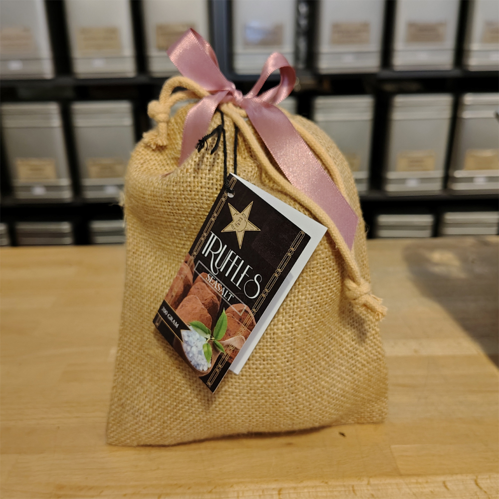 Krämiga tryfflar i söt jutepåse med sidenband.